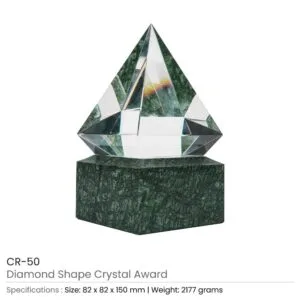 Diamond-shaped crystal awards are packaged in a Mahogany color Wooden Box with a marble base. Angled incisions around the Diamond Obelisk’s perimeter allow the crystal to shine. Add names and graphics that stand out in a frosted etching to personalize your trophy.