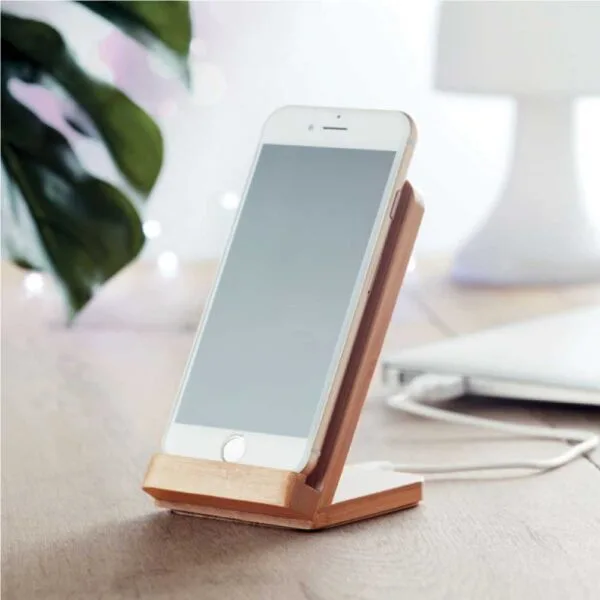 Charger for most mobile devices that supports QI wireless charging in a bamboo casing & with a stand.