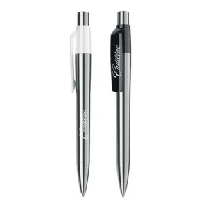 Metal pens from Maxema are stylish for the workplace. They used sturdy metal for their creations. They are strong and secure to utilize as a result. Its barrel was made specifically for it from metal with a silver finish. As a result, the entire barrel has a shiny diamond mirror surface. The tip and barrel are both silver in tone. The push-button of the pen is silver-plated as well. As a result, it makes the pen appear expensive. As a result, you may have these pens personalized as elegant corporate presents for your business. The clip of this pen was made of ABS plastic in addition to the barrel. Either black or white applies. The clip does, however, also have a shiny surface. Options for screen printing and UV printing are included.
