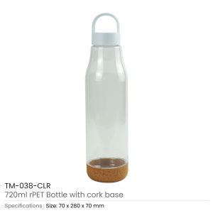 Introducing our 720ml rPET bottles with a cork base, designed for both style and sustainability. Crafted from recycled polyethylene terephthalate (rPET), the bottle provides an eco-friendly solution while maintaining durability. It features a distinctive cork base that adds a touch of elegance while providing a stable foundation. The twist-off lid ensures a secure seal and easy access, while the integrated handle makes carrying and pouring effortless. Perfect for those seeking a practical and environmentally conscious choice for their liquid storage needs.